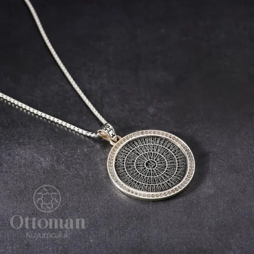 Kolye modelinin kenar ve arka kısmında yer alan özel Vav Harfi, tasarıma anlam katan bir diğer önemli detaydır. Vav harfi, hem estetik hem de kültürel bir simge olarak, kolyeye özgün bir dokunuş katar. Bu detay, kolyenin sade ama etkileyici tasarımını tamamlar.