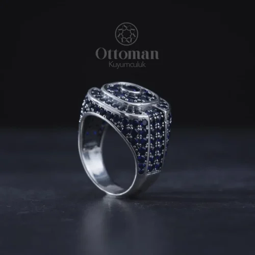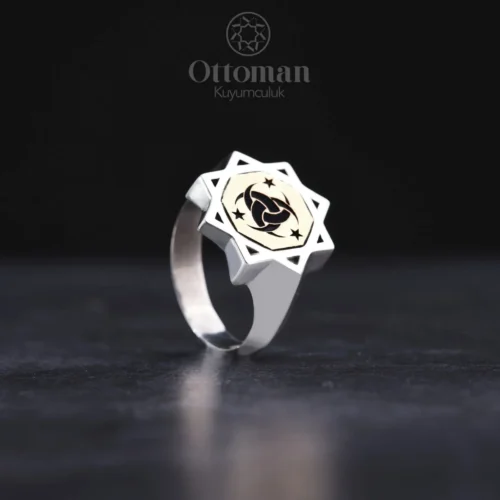 Bu özel yüzüğün tasarımı, Osmanlı İmparatorluğu’nun ihtişamını ve zarafetini yansıtır. Üst kısmına işlenen Osmanlı sancağı motifi, yüzüğe tarihi bir anlam kazandırır. Gravür desenlerle süslenen yüzük kasası, detaylara verilen önemi ve ustalığı gösterir. Yan kısımlara sıralı siyah zirkon taşlar mıhlanarak yüzüğe modern bir dokunuş eklenmiştir. Bu detaylar, yüzüğün hem geleneksel hem de çağdaş bir görünüm sunmasını sağlar.