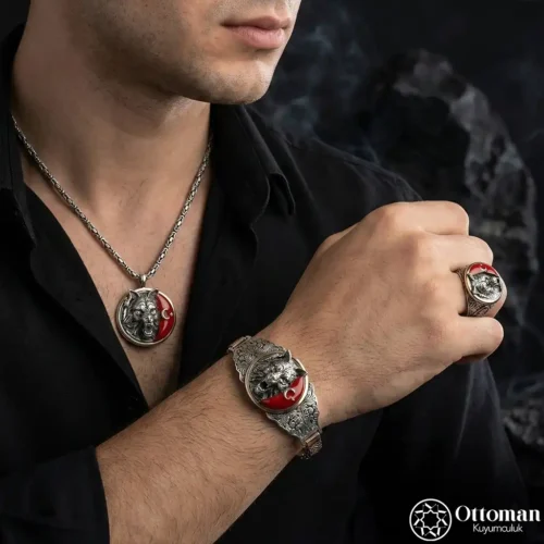 Ay Yıldızlı Bozkurt Gümüş Kolye Bileklik ve Yüzük Set