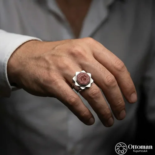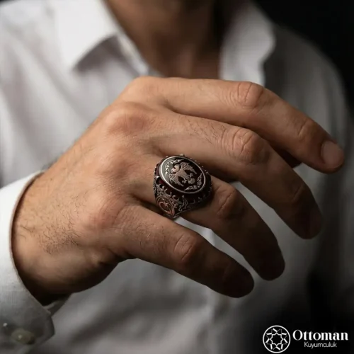 Akik Taşlı Çift Başlı Kartal Gümüş Erkek Yüzük