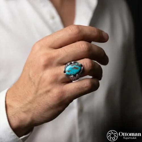 Doğal Taş Gravür Desenli Firuze Gümüş Erkek Yüzük
