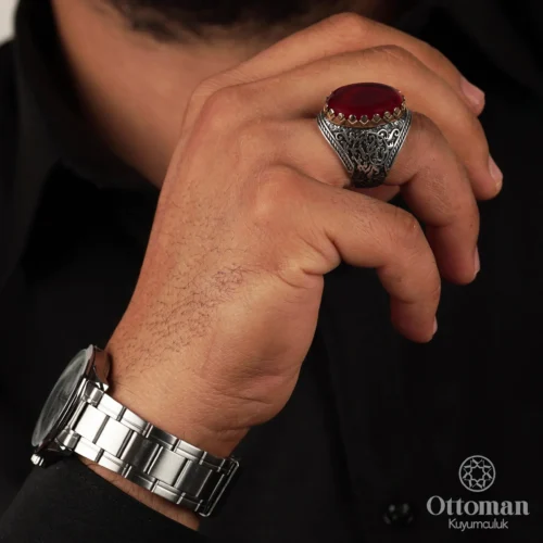 Kırmızı Ateş Kehribar Taşlı Gümüş Erkek Yüzük