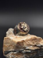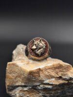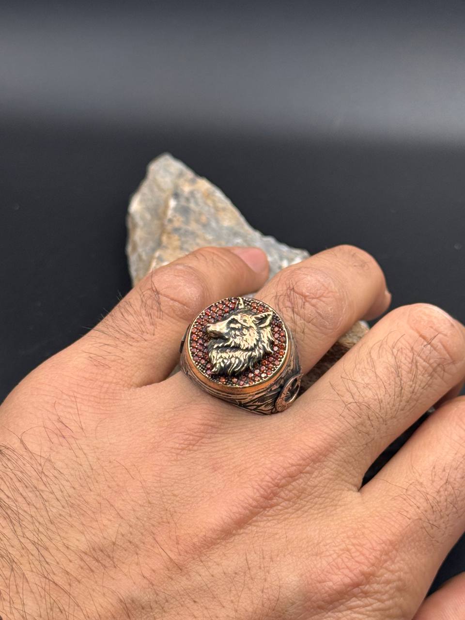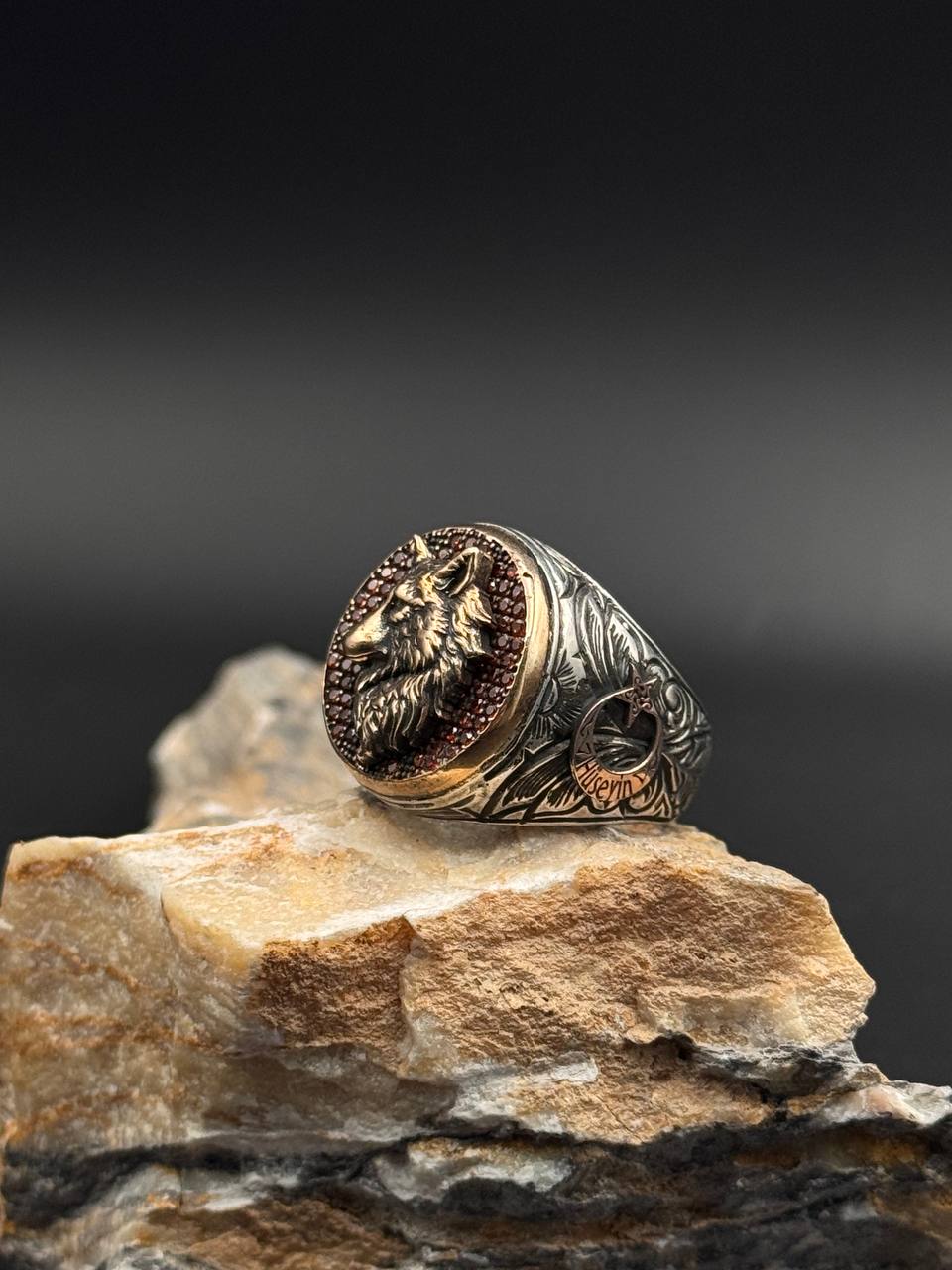 Ürünümüz 925 ayar gümüşten üretilmişti olup üst kısma garnet taş üzerine kurt figürü işlenmiştir.